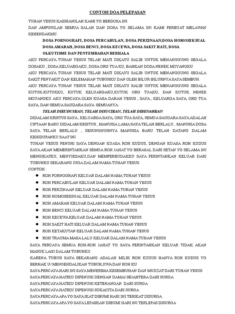 Our respectable all our teacher and all who were present at this event. Di bawah ini ada beberapa kumpulan contoh doa kristen untuk mematahkan melawan mengusir membasmi menghanguskan dan menghilangkan kuasa roh gelap dan kejahatan dalam tubuh. Gagasan tentang pelepasan atau pembebasan muncul dalam Alkitab dengan arti biasa secara sekuler mis Mzm 10520.