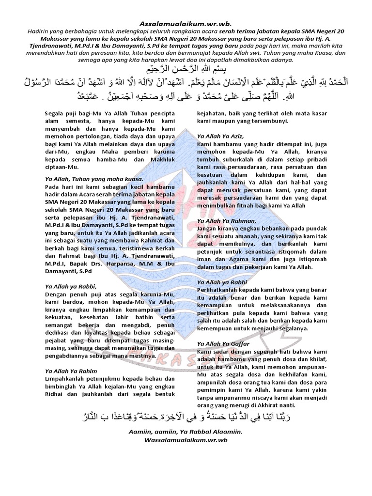 Doa Acara Pelepasan Pegawai Pensiun Tidak terasa salah seorang rekan kerja telah memasuki masa purna bakti. Akhir kata saya memohon doa restu kepada Bapak Kepala Sekolah Bapak dan Ibu Guru serta saudara semua agar setelah meninggalkan sekolah ini kami tetap bisa membawa nama baik sekolah. Saat membacakan doa setelah akad ini hendaknya pengantin pria meletakkan tangannya di ubun-ubun istri.