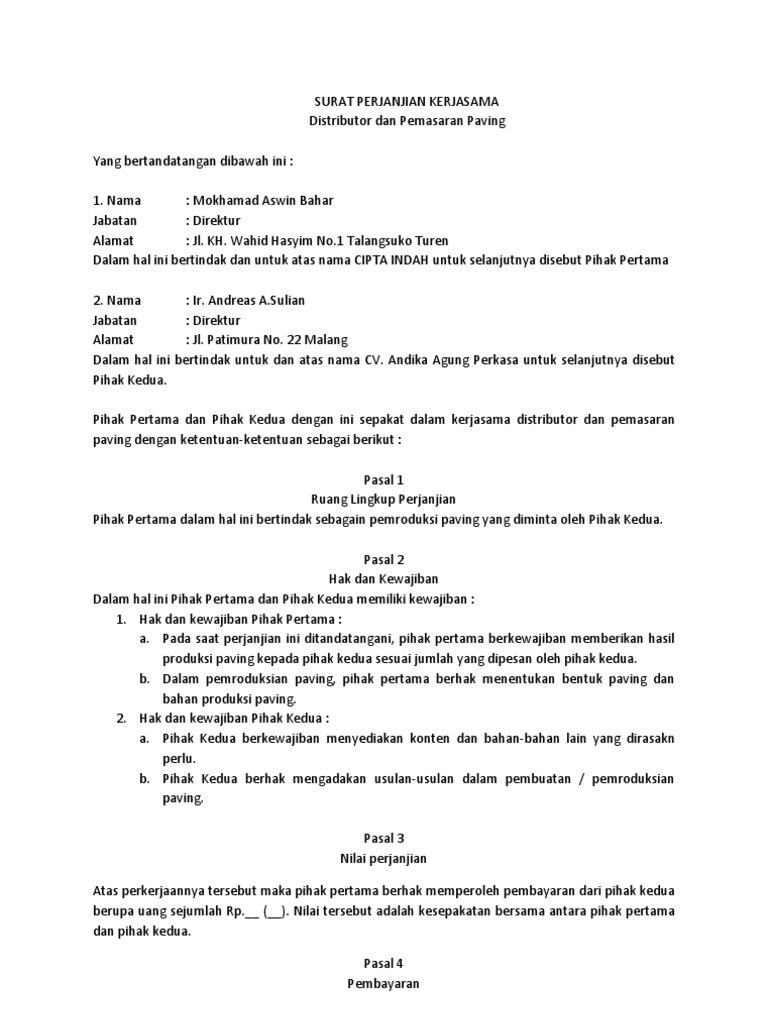 Saat menyusun surat kerjasama bagian-bagian yang harus tercantum di dalamnya adalah. Dalam Surat Perjanjian Distribusi bisa melibatkan pihak-pihak. Surat pernjanian kerjasama juga dapat dilakukan oleh tiga orangJika Anda ingin melakukan perjanjian kerjasama dengan lebih dari satu orang maka ada baiknya Anda menyimak contoh surat perjanjian adanya kerjasama tersebut sebagai berikut.