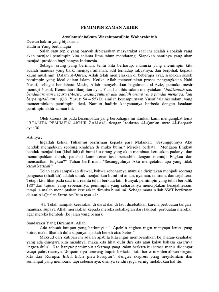 Teks ceramah tentang akhir zaman singkat. Untuk cara membawakannya harus dibingkai dengan sebagus mungkin singkat padat dan jelas sehingga mudah. Teks Pidato Islami SIngkat Bahasa Indonesia. Nabi shalallahu alaihi wa sallam mengabarkan tentang fitnah-fintah akhir zaman agar ummat berhati-hati dan selalu bertakwa serta kembali berpegang teguh dengan sesuatu yang dilakukan oleh para pendahulu.