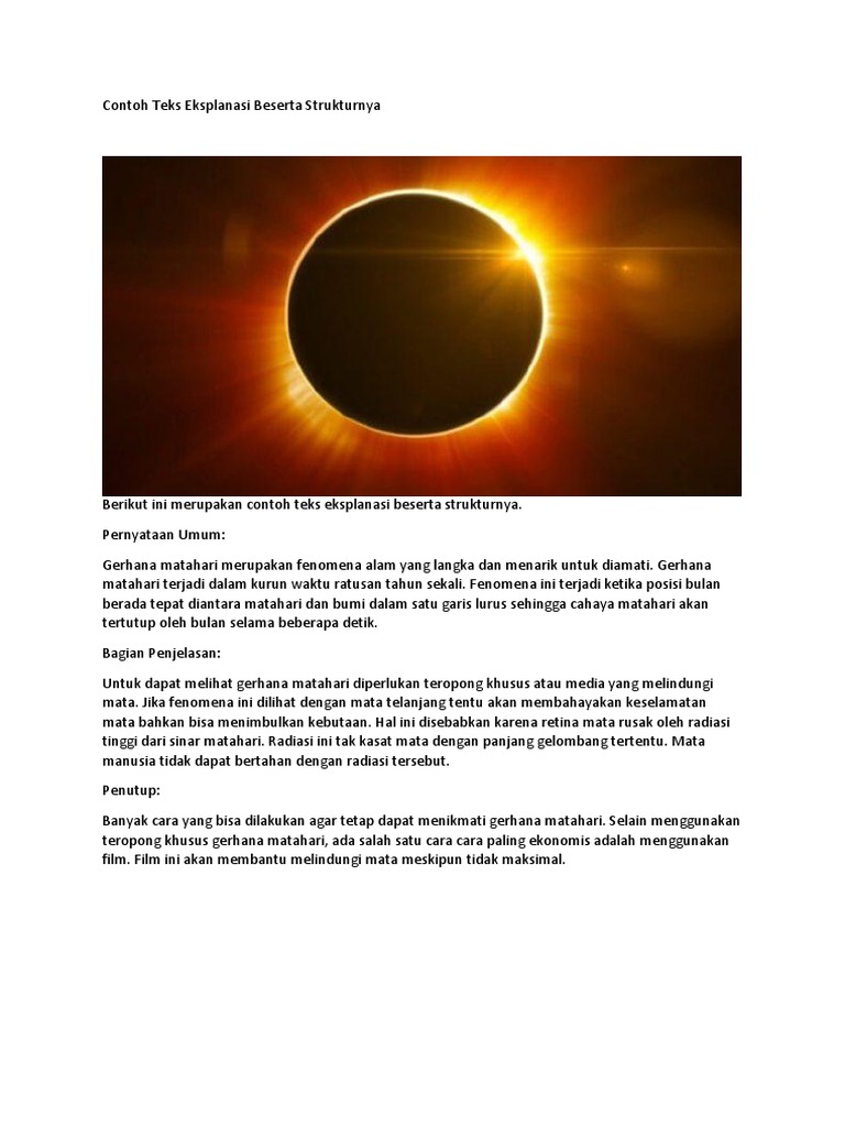 Salah satu contoh teks eksplanasi gerhana bulan adalah sebagai berikut. Namun akan lebih mudah jika kita mengetahui secara langsung bagaimana contoh teks eksplanasi singkat beserta struktrnya. Peristiwa alam ini terjadi apabila bulan beroposisi dengan matahari.