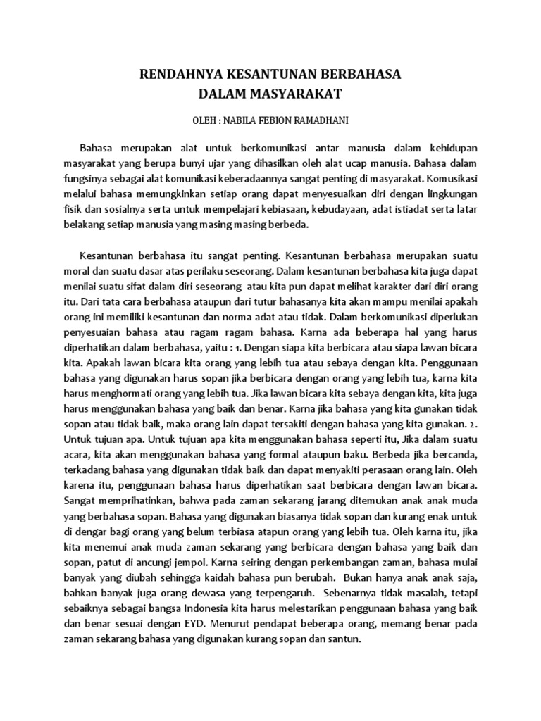 Admin dari blog Berbagi Teks Penting2019 juga mengumpulkan gambar-gambar lainnya terkait teks eksposisi rendahnya kesantunan berbahasa dalam masyarakat dibawah ini. ABSTRAK Kesantunan berbahasa merupakan perkara asas untuk menghasilkan aturan sosial dan prasyarat bagi kerjasama sesama manusia dalam mana-mana masyarakat Gumprez dlm Levinson 1987. Satu Kajian Perbandingan Etnik Nasariah Mansor Faizah Ahmad Yusniza Yaakub Abstrak Dalam usaha untuk berinteraksi setiap masyarakat mempunyai beberapa norma atau peraturan sosial untuk memastikan aspek kesantunan dan kesusilaan terpelihara.