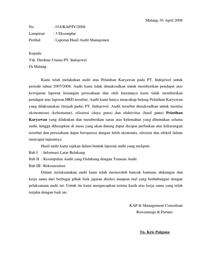 Isinya adalah informasi tentang area dan proses yang diaudit standar mana yang memberikan dukungan untuk melaksanakan audit Misalnya ISO 9001 ISO 14001. Tujuannya guna menilai seberapa jauh sistem yang diaplikasikan berfungsi sebagaimana diharapkan. Contoh laporan kompilasi Kami telah melakukan kompilasi neraca PT ABC tanggal 31 Desember 2009 serta laporan rugi laba laporan perubahan ekuitas dan laporan arus kas yang berkaitan untuk tahun yang berakhir pada tanggal tersebut sesuai dengan Standar Jasa Akuntansi dan Review yang ditetapkan oleh Ikatan Akuntan Indonesia.