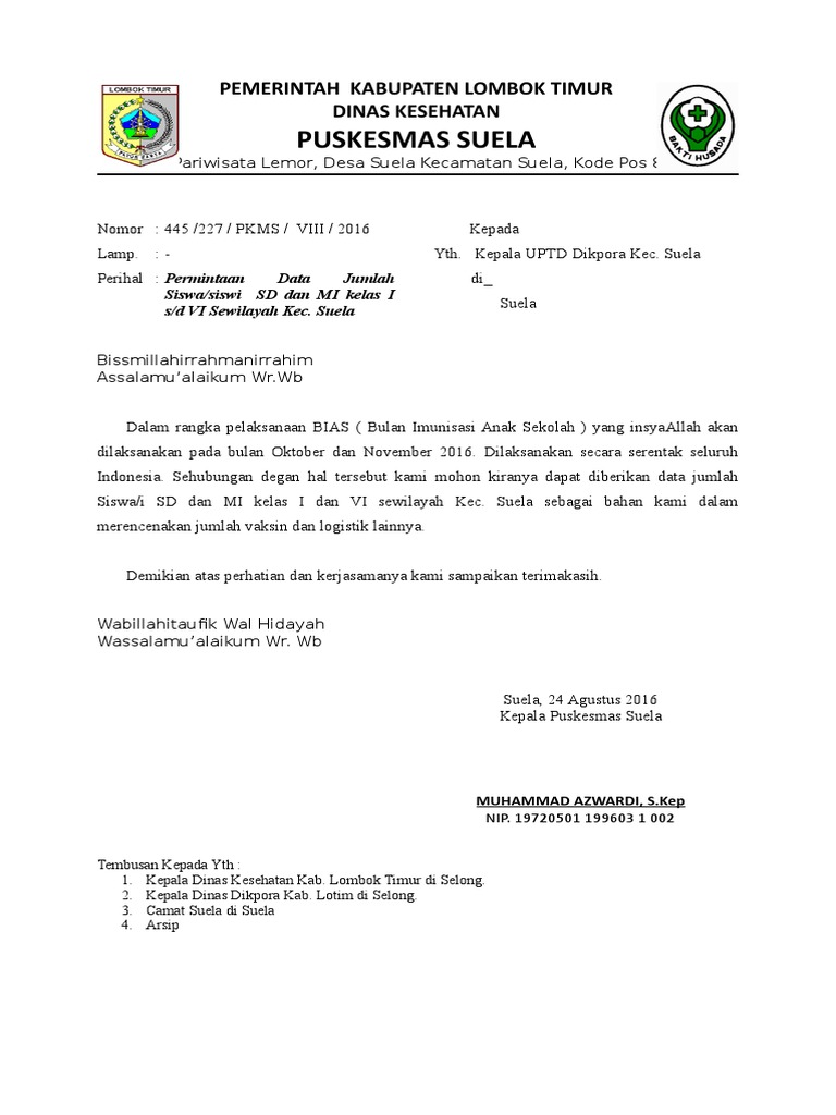Batas akhir penyampaian datadokumen elektronik data scan HIMBAUAN UNTUK TIDAK MEMBERIKAN CUTI TAHUNAN SEBELUM DAN SESUSAH CUTI BERSAMA IDUL FITRI 1438 H Satu tanggapan untuk SURAT PERMOHONAN DATA KE SEMUA OPD PERIHAL PENYUSUNAN KEBUTUHAN ASN. Pada kesempatan yang lalu kita telah membahas banyak sekali contoh surat salah satunya yaitu contoh surat penawaran dan pernyataan. 15 Contoh Surat Dinas Perusahaan Pemerintahan dan Lembaga Pendidikan - Ada berbagai macam dan jenis surat yang ada sekarang ini yang biasanya digunakan untuk urusan formal atau resmi.