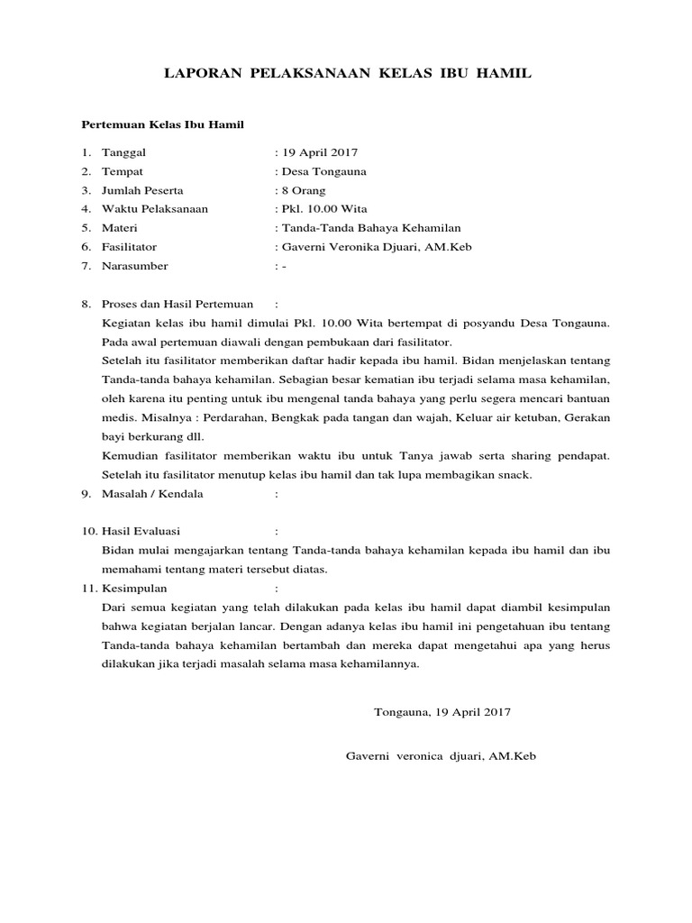 Kelas ibu hamil merupakan sarana untuk belajar bersama tentang kesehatan bagi ibu hamil dalam bentuk tatap muka dalam kelompok yang bertujuan meningkatkan pengetahuan dan ketrampilan ibu-ibu mengenai kehamilan persalinan perawatan nifas dan perawatan bayi baru lahir mitos penyakit menular dan akte kelahiran Depkes RI 2009. Peserta Peserta kelas ibu balita adalah kelompok belajar ibu-ibu yang mempunyai anak usia antara 0-5 th dengan status gizi bayi balitanya yang gizi kurang. Monday May 20 2019 contoh laporan hasil kegiatan kelas ibu hamil.